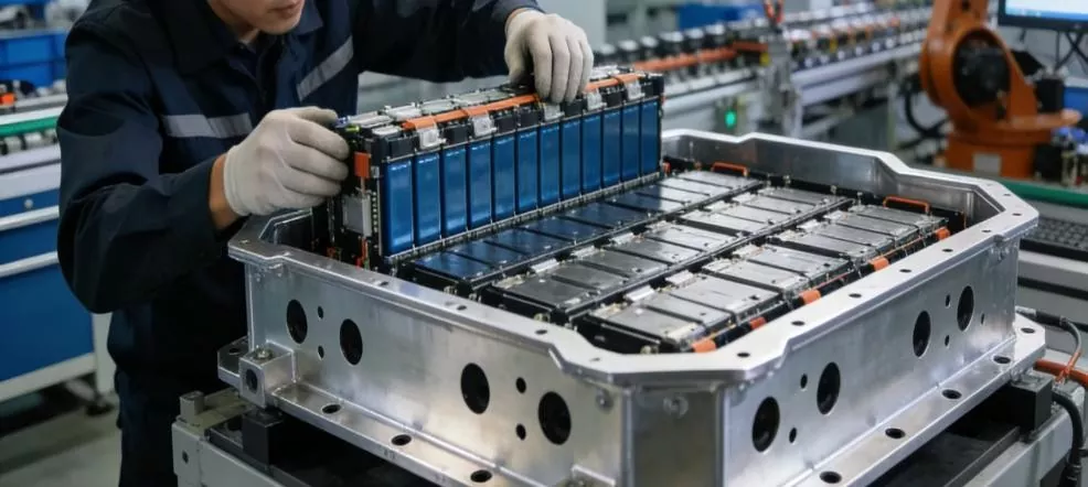 Liikennesektori: Lähikuva uuden energian ajoneuvon akkupaketin runkokokoonpanosta