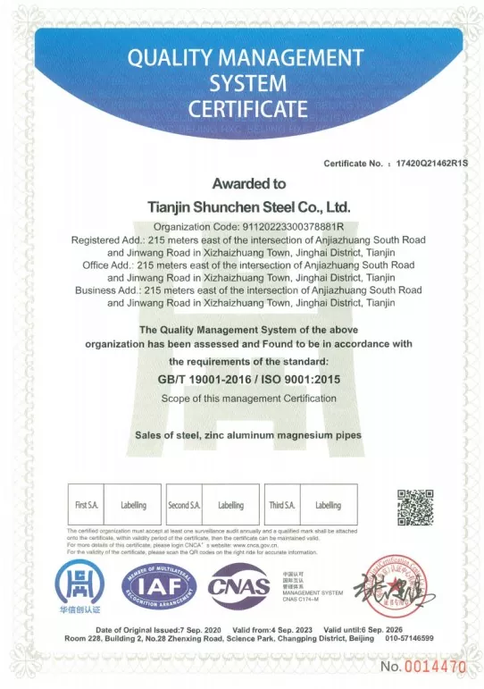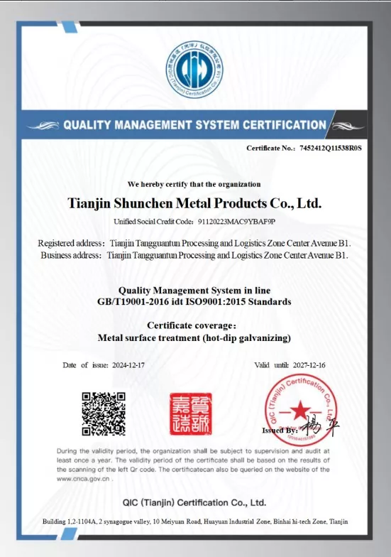 Tianjin Shunchen Industrial Companylla on yli kolmen vuosikymmenen tuotantokokemus terästeollisuudesta. Yrityksellä on ISO 9000-, 3A-järjestelmäsertifikaatit sekä Euroopan unionin CE-sertifiointi, ja se on luonut täydellisen teollisen ketjun asettelun galvanoinnin käsittelystä myyntiin ja jakeluun. Tiukan 12-vaiheisen prosessin ja kolmiportaisen kattavan tarkastusmekanismin ansiosta yritys on saavuttanut nollan vuosittaisen laatu- ja turvallisuusonnettomuuden ja nollajärjestyksen oletusarvojen ennätyksen 12 peräkkäisenä vuonna. Shunchen Industrialilla on ympärivuotinen yli 20 000 tonnin sinkitty teräspistevarasto, joka muodostaa laajan galvanoidun teräksen supermarketin, joka yhdistää varastoinnin ja jakelun. Varaston pinta-ala on 10 000 neliömetriä, mikä tarjoaa vankan tuen integroidulle tuotanto- ja myyntipalvelulle.